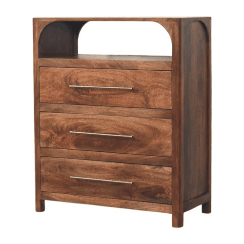 Introducing the Arc-Line 3 Drawer Chest, where soft curves meet strong craftsmanship. Handcrafted from 100% solid mango wood in our rich Roasted Almond finish, this chest blends functionality with contemporary elegance. The smooth arch detail at the top adds a sculptural element, while the three spacious drawers—adorned with sleek metal handles—offer ample storage for linens, clothing, or everyday essentials. Ideal for bedrooms, living rooms, or entryways, this piece brings warmth and sophistication to any setting.