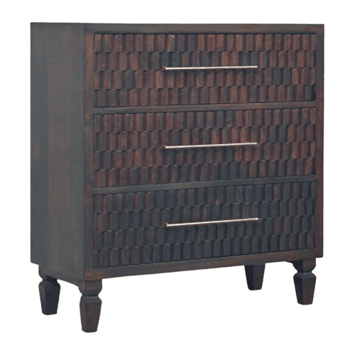 Discover the sculptural beauty of the Arno Chest, handcrafted from solid mango wood and finished in a deep Velvet Mocha tone. The rhythmic, three-dimensional carving across the drawer fronts creates a bold interplay of light and shadow, while the clean silhouette and antique brass handles lend a touch of sophistication. A masterful blend of texture and function, this chest brings contemporary character and timeless craftsmanship to any room.