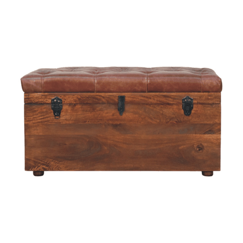 Combining rustic charm with practical functionality, this storage trunk is handcrafted from 100% Solid Mango Wood in a warm California Walnut finish. The hand-tufted design on the plush seat, upholstered in Buffalo hide leather, adds a classic touch of sophistication and comfort. Featuring sturdy metal latches and ample storage space, it keeps your belongings organized and out of sight while enhancing your decor. Perfect for entryways, living rooms, or bedrooms, this versatile piece brings timeless style and sustainable craftsmanship to your home. Its natural wood grain, durable construction, and elegant detailing make it a unique and lasting addition to any space.