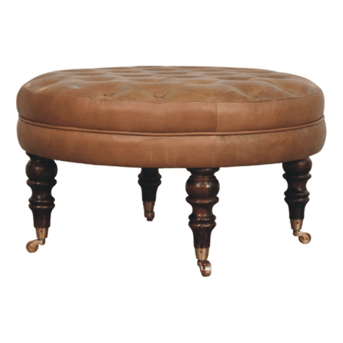 Bringing a touch of heritage charm to your home, this round ottoman is upholstered in 100% Buffalo hide leather with a luxurious hand-tufted design. The deep button detailing adds timeless elegance, while the handcrafted turned legs made from 100% Solid Mango Wood in rich walnut finish enhance its classic appeal. Fitted with brass castor wheels, it offers effortless mobility, making it a versatile addition to living rooms, bedrooms, or entryways. Whether used as a footrest, accent piece, or extra seating, this ottoman combines sophisticated craftsmanship with practical functionality for a refined and inviting space.
