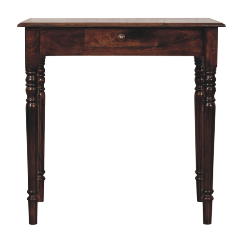 This one drawer writing desk is constructed from 100% solid mango wood and has a french This one drawer writing desk is constructed from 100% solid mango wood and has a french california walnut base and a stained california walnut top. Other features include hand-carved flute legs to add to the vintage French style and a shell handles for easy access into the drawer. The perfect addition to any home. base and a stained california walnut top. Other features include hand-carved flute legs to add to the vintage French style and a shell handles for easy access into the drawer. The perfect addition to any home.