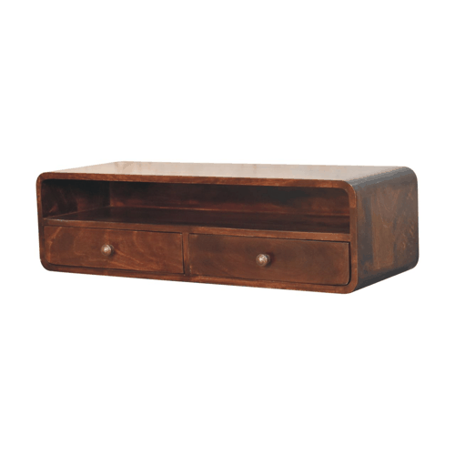 This curved wall-mounted console table is the perfect way to save space and avoid the hassle of legs in the home. Constructed from 100% solid mango wood it has a california walnut finish and great storage options with 2 drawers and a large open shelf. Use alone or with the rest of the curved chestnut collection.