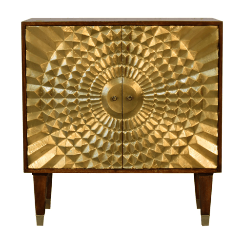 This Eden Cabinet is made of solid mango wood, with a chestnut finish structure. It has slots inside for convenient storage space and ample space on top to display ornaments, plants or photo frames. Additionally, the exquisite craftsmanship and beautiful gold brass sheet provide a beautiful carved pattern on the door fronts making this an all round eye-catching piece of furniture in your home.