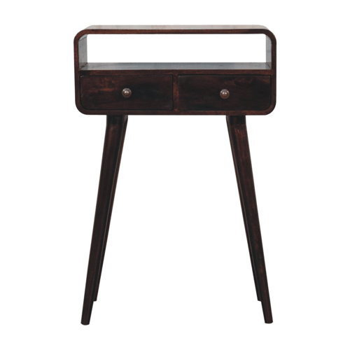 The mini version of our popular IN311, this simple, elegant console table has beautifully curved edges to fit perfectly in any living space, it features two drawers and 1 open slot to help you keep your home and has shiny knobs with a california walnut finish and 4 Nordic style legs. This petite product is a part of Recession Collection.