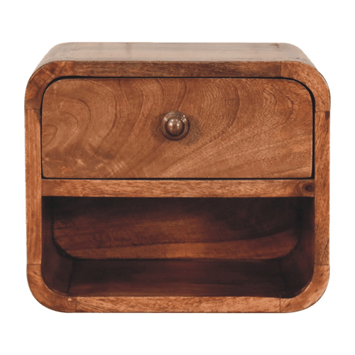 Inspired by our curved range, this minimalistic mini wall-mounted unit has been constructed from 100% solid mango wood in a honey caramel finish and features 1 drawer and 1 open slot. This piece is perfect for storing any bits and pieces you wish to keep close by before bedtime. Its neat and clean design can easily be mounted on the wall without the fuss of any legs. Caution! Do not sit on the unit.