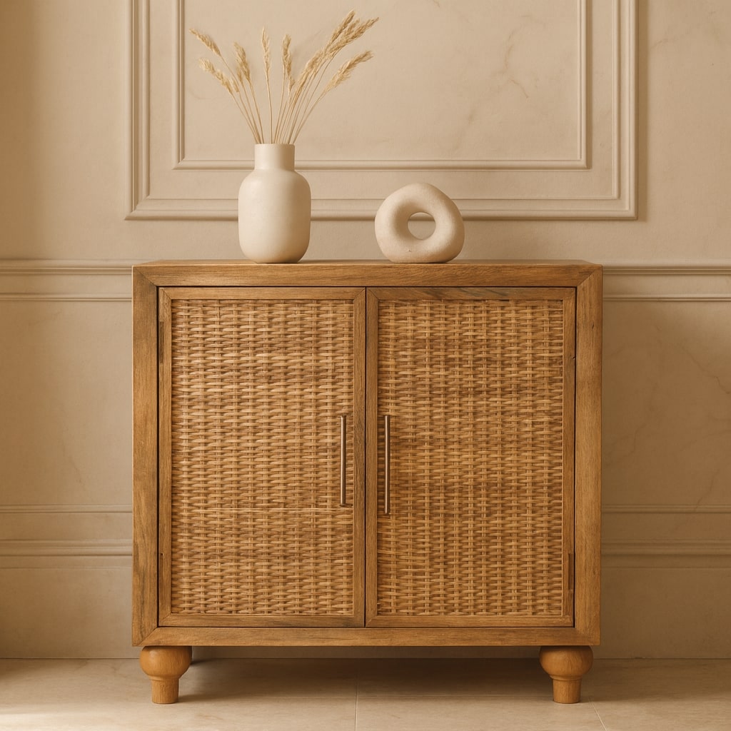 Blending natural textures with timeless craftsmanship, the Rattan Oak 2-Door Cabinet is a beautiful storage piece for any room. Handcrafted from 100% solid mango wood in an elegant oakish finish, it features intricately handwoven rattan door panels that add warmth and artisanal charm. The compact silhouette rests on classic bun feet and is finished with sleek brass-toned handles for a refined touch. Whether placed in an entryway, bedroom, or living space, this cabinet offers both style and utility—perfect for tucking away your everyday essentials in elevated fashion.