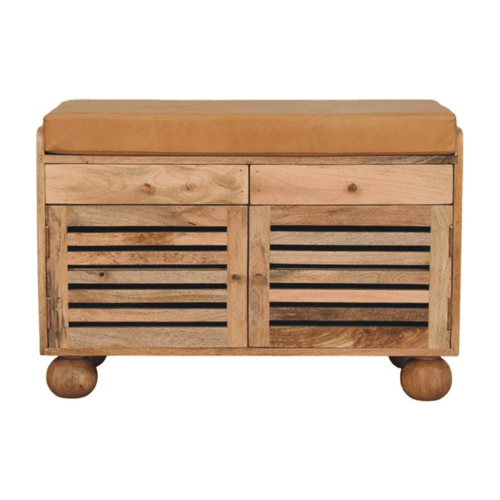 Introducing the Windsor Shoe Rack, where timeless design meets practical elegance. Handcrafted from 100% solid mango wood in a natural oak-ish finish, this piece features a comfortable tan buffalo hide leather cushioned seat, perfect for tying shoes or resting. With two drawers and a slatted double-door cabinet, it offers ample space to organize shoes and accessories while maintaining airflow. The unique round wooden feet and sleek brass knobs add a touch of sophistication, making it a stylish and functional addition to entryways, bedrooms, or living areas. The Windsor Shoe Rack combines utility and charm to elevate your home organization.