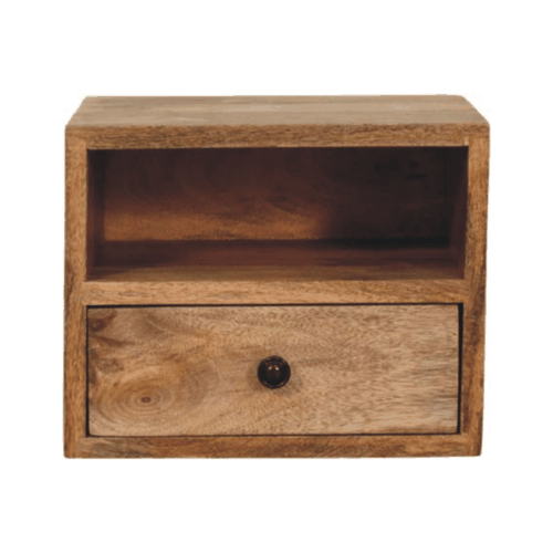 Redefine your bedroom aesthetic with the Solis 1-Drawer Wall Mounted Nightstand, a standout piece from the Solis Collection. Designed to maximize functionality while saving space, this wall-mounted nightstand features an elegant Oak-ish finish that highlights the natural beauty of mango wood. Its open slot offers easy access to essentials or decorative pieces, while the single drawer provides discreet storage for a clutter-free look with sleek black metal knob . With its clean lines and warm tones, the Solis 1-Drawer Nightstand seamlessly blends rustic charm and modern design, making it an essential addition to any stylish and organized home.