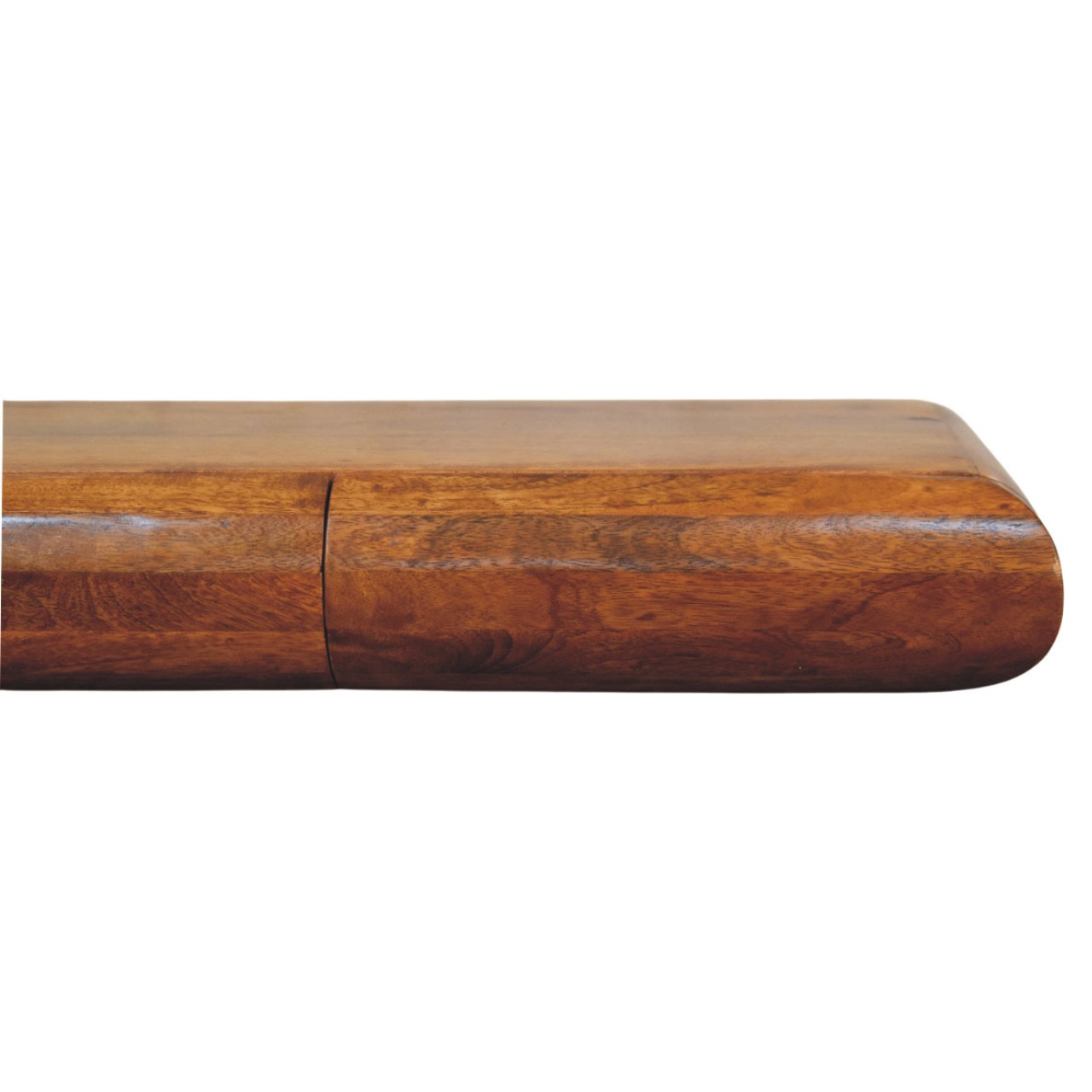 The Solis Wall-Mounted Console is a masterpiece of sleek form and subtle luxury. Handcrafted from 100% solid mango wood in a glowing Amber Oak finish, it features a smooth curved-edge design with two hidden drawers that offer discreet storage. Its floating silhouette creates a modern, airy aesthetic that enhances both compact and spacious interiors. Perfect for hallways, living rooms, or bedrooms, the Solis Console combines functional elegance with refined minimalism — a timeless addition to any contemporary home.